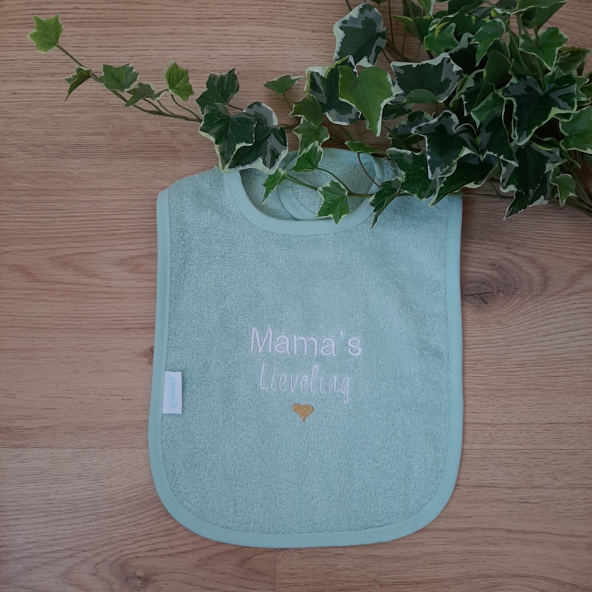 Geborduurde slab mintgroen /goud
