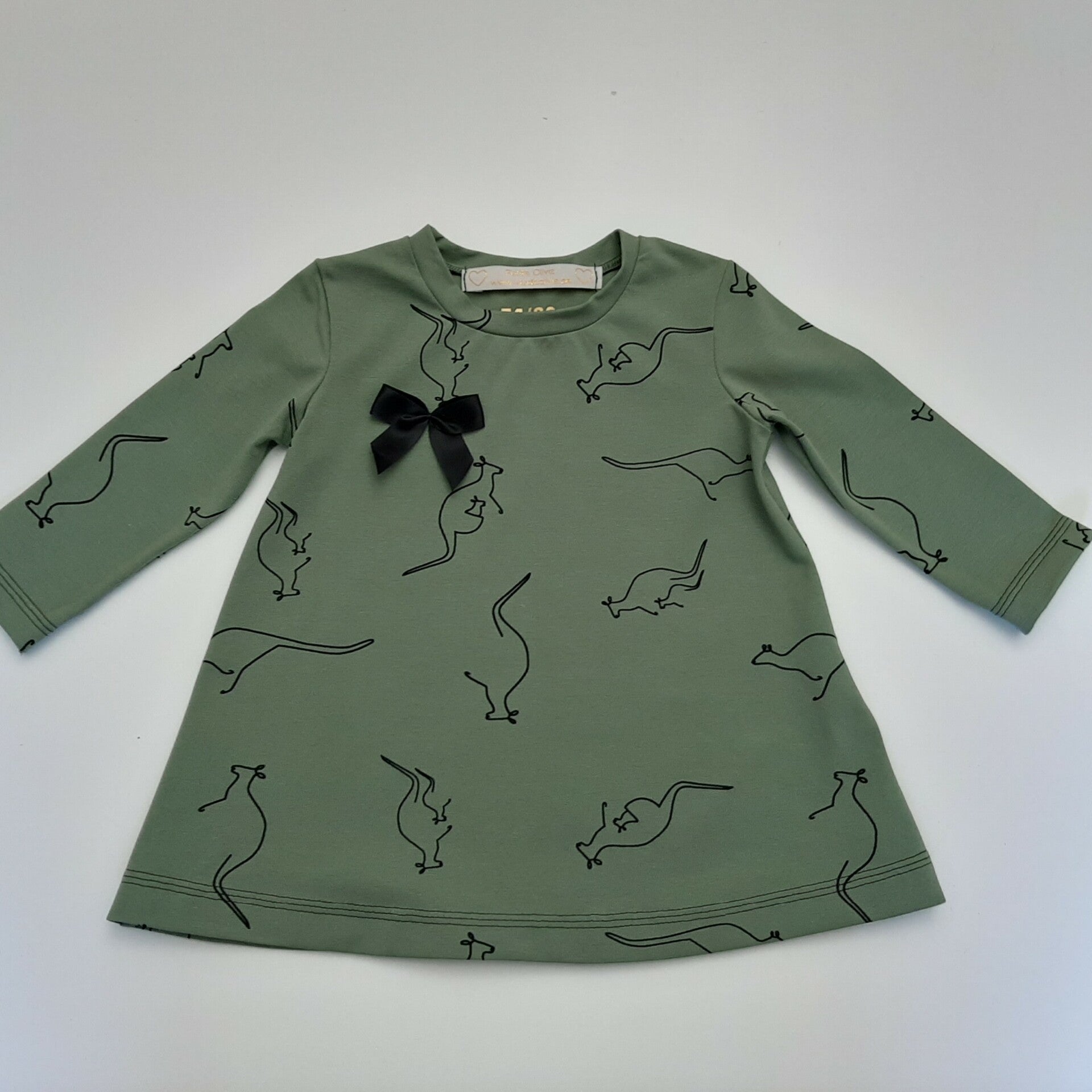 Jurkje in A-lijn kaki groen met zwarte kangeroes