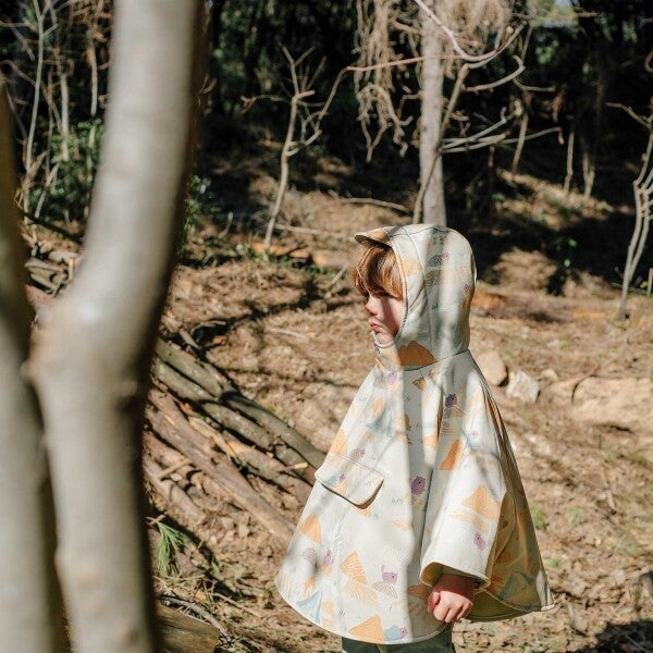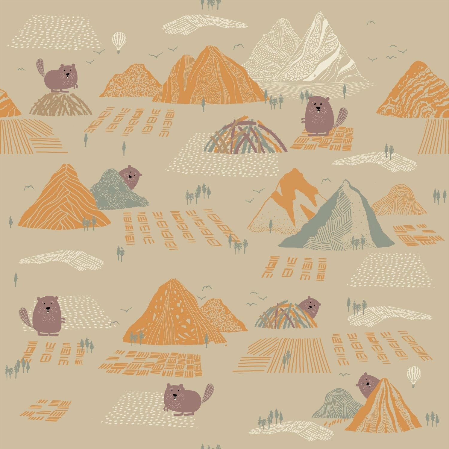 Soft-Shell stof met fleece binnenzijde met opdruk van bevers en bergen.